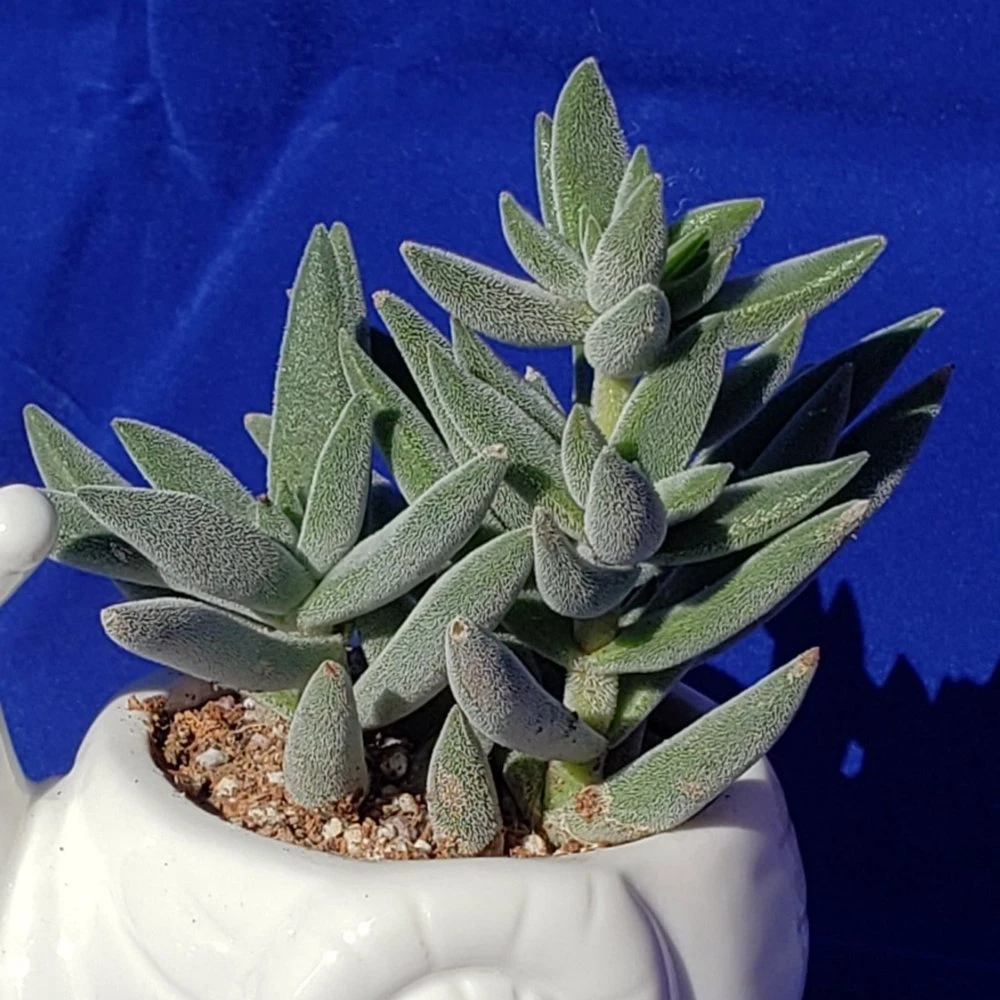 Tenelli Crassula brings elongated stems that are covered in a slivery velvet, giving the entire plant a dreamy, ‘frosted’ effect. With its upright growing habit and the juxtaposed lance shaped ‘leaves’, it adds a certain unique height and texture. It yields small clusters of red flowers.